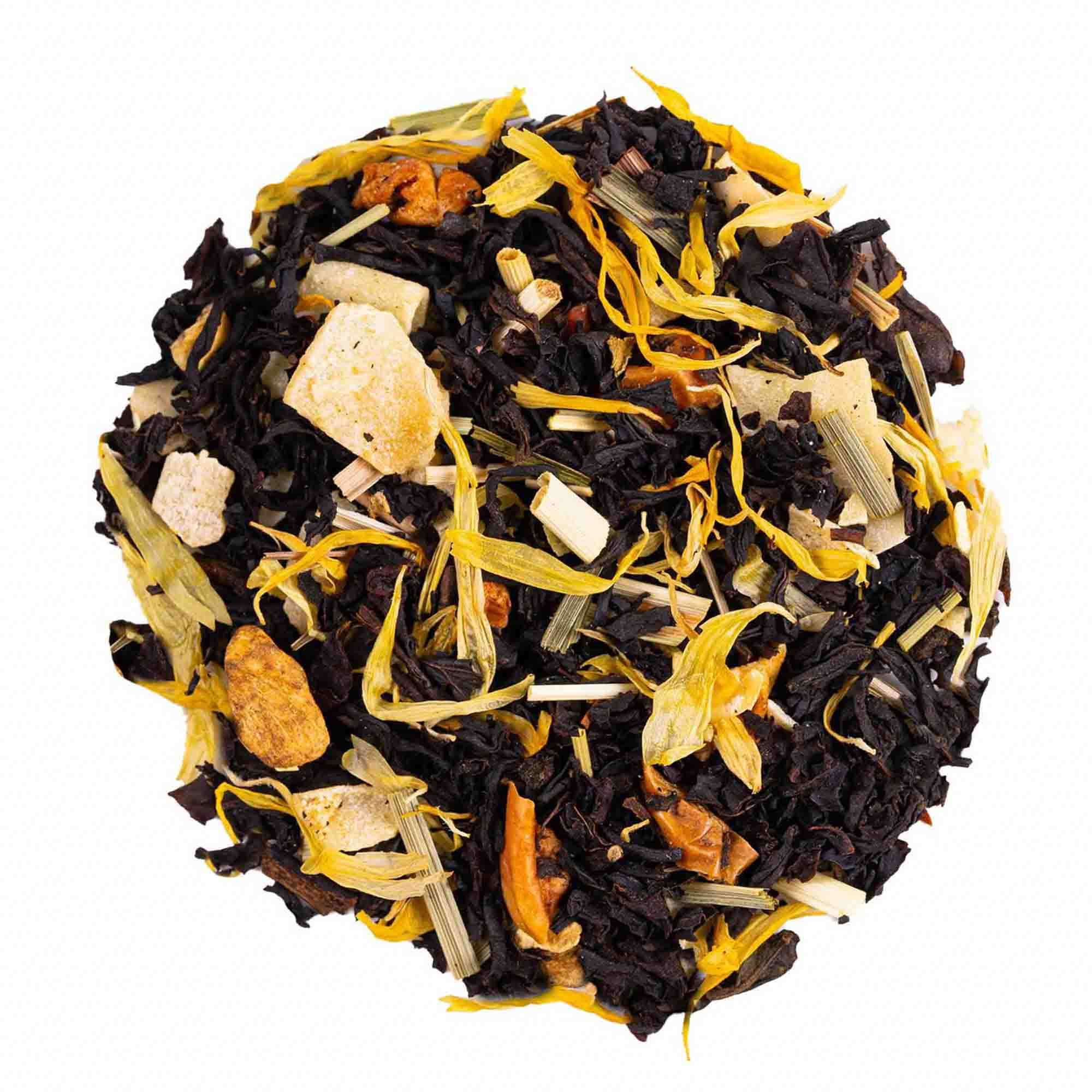 Schwarzer Tee Ceylon, -Südindien, -China, Kokos (Kokosnuss, Kokosfett, Zucker), Ananas (Ananas, Zucker), Lemongras, Apfel, Ingwer, natürliches Aroma, Ringelblumen.