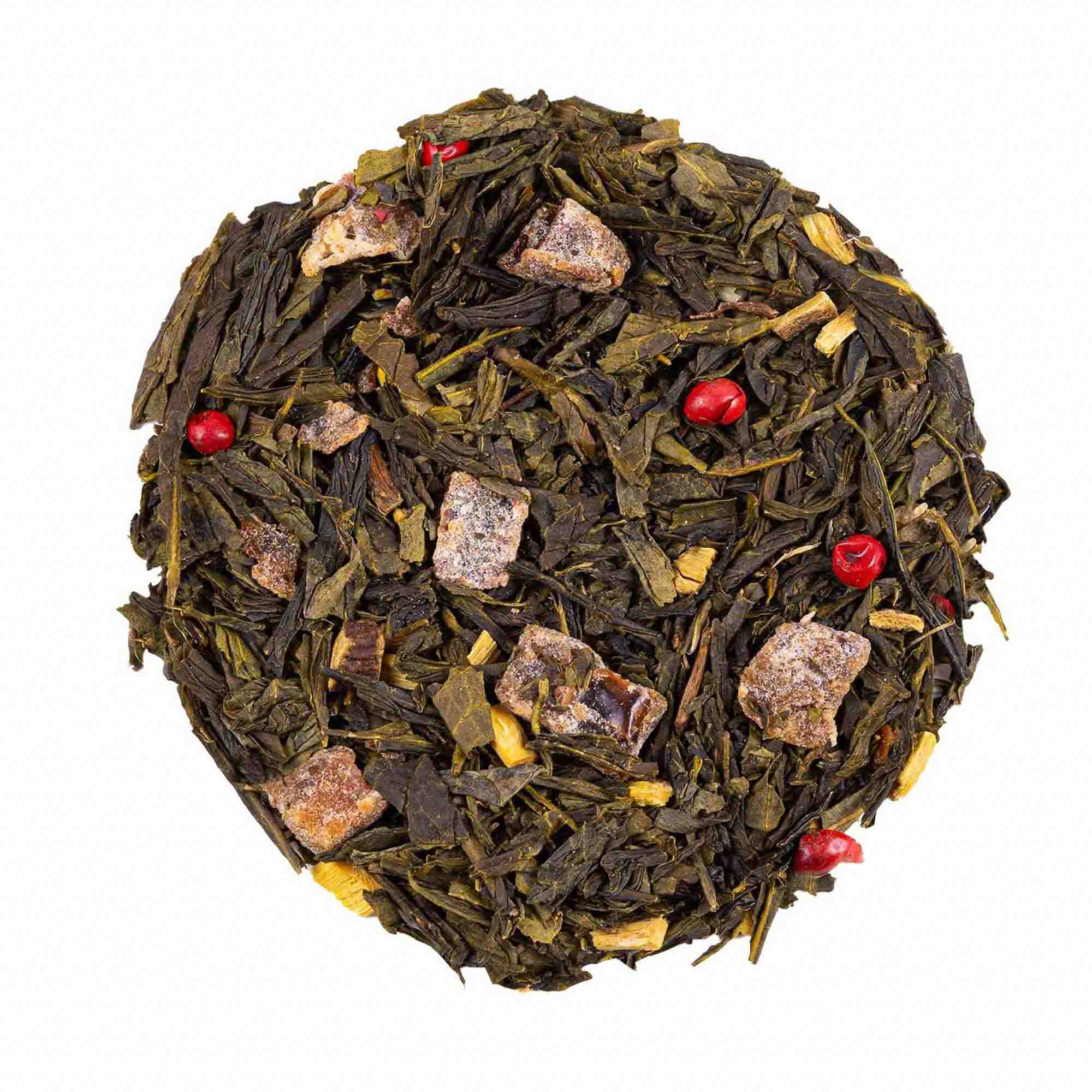 Grüner Tee China Sencha, Dattel (Dattel, Reismehl), Süßholzwurzel, Aroma, Birne (Birne, Reismehl), Pfeffer rosa, Kardamom.