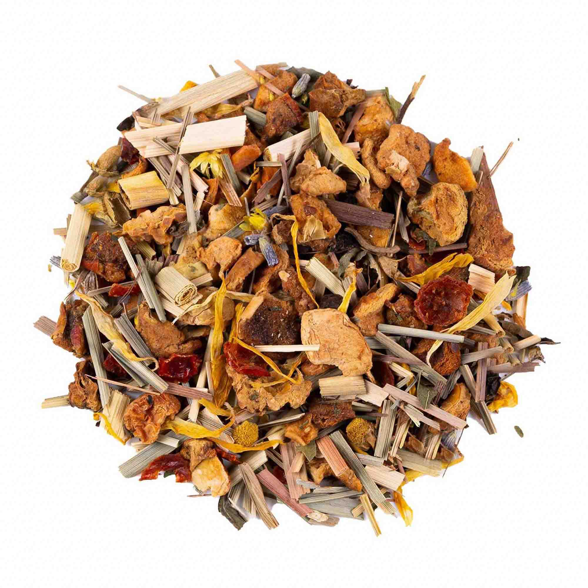 Apfel*, Lemongras*, Hagebutte*, Kamille*, Tulsi*, Pfeffer schwarz*, Pfefferminze*, Lavendel*, Stevia*, Ringelblumen*, Katzenpfötchen*, Kardamom*, Baldrian*. *Aus kontrolliert biologischem Anbau