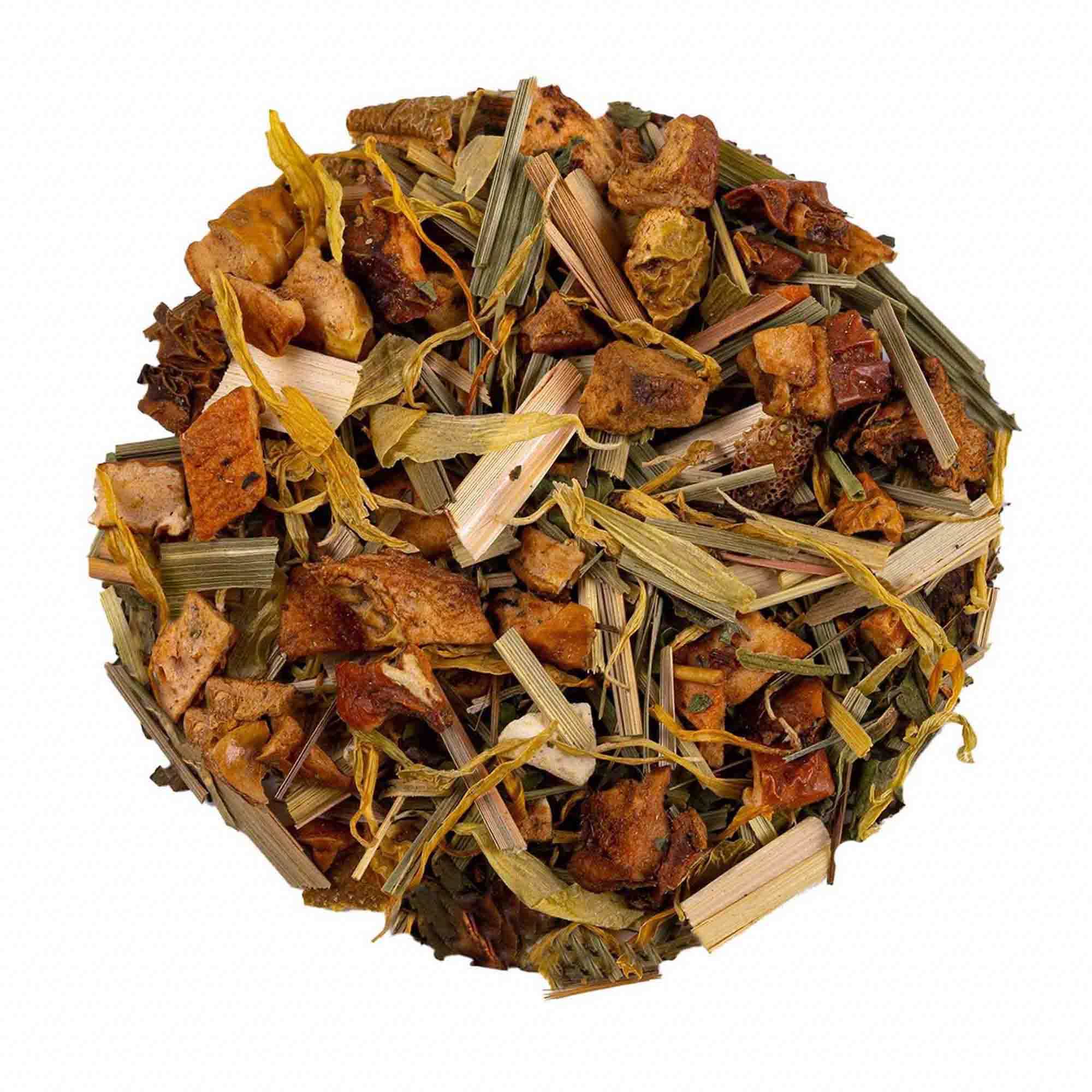 Apfel, Rooibos Super Grade, grüne Minze, Lemongras, Orangenschalen, natürliches Aroma, Süßholzwurzel, Ringelblumen, Kiwischeiben, Ginkgo, natürliches Orangen Aroma.